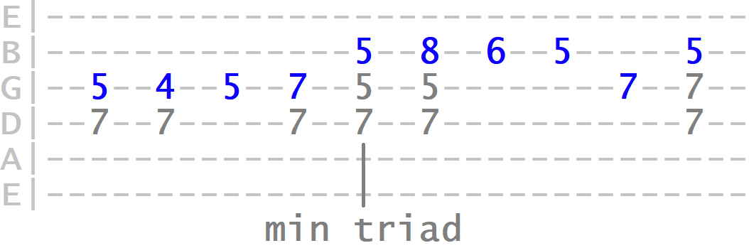 Podríamos armonizar esta melodía alrededor de formas de acordes familiares de la siguiente manera, con las mismas notas de la melodía marcadas en azul ...